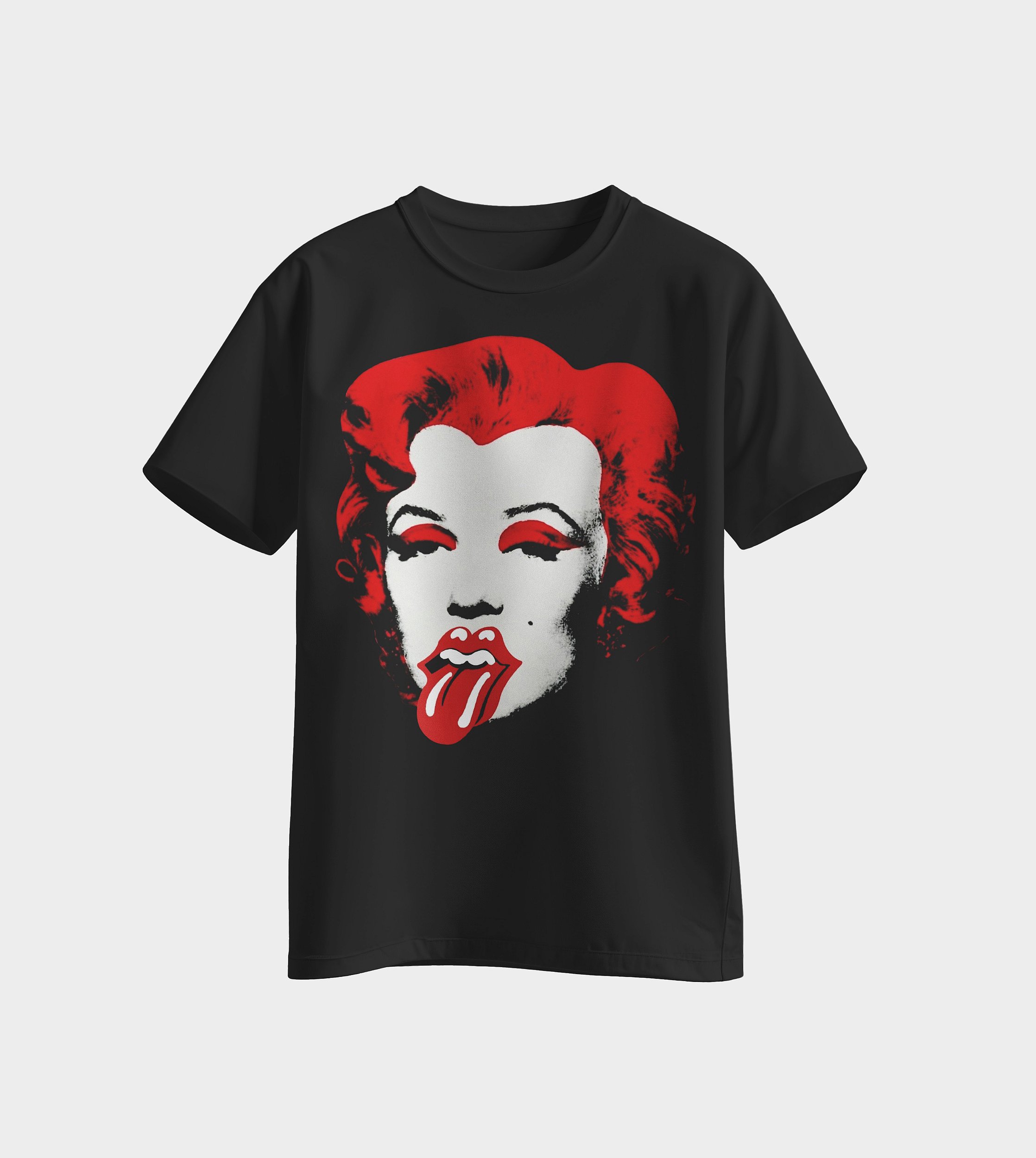 Estampa que mescla duas artes icônicas: a fotografia de Marilyn Monroe com edições baseadas nas obras de Andy Warhol e o símbolo da banda Rolling Stones.