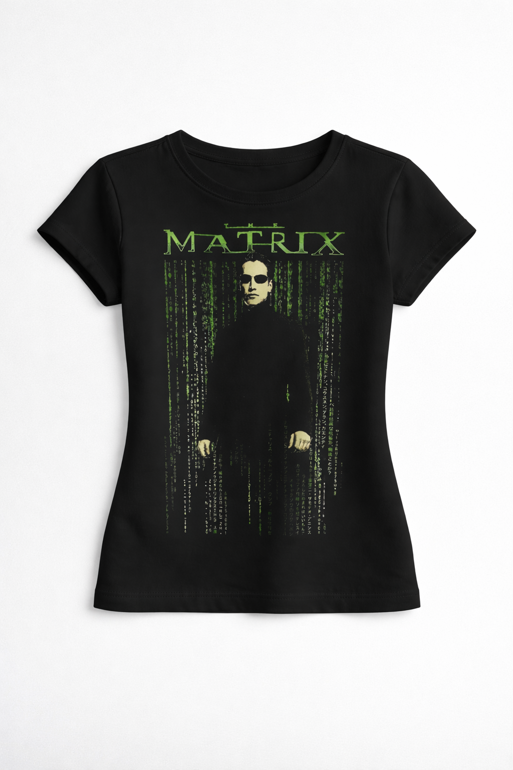Estampa do filme Matrix de 1999, no centro da estampa há o personagem principal (NEO)