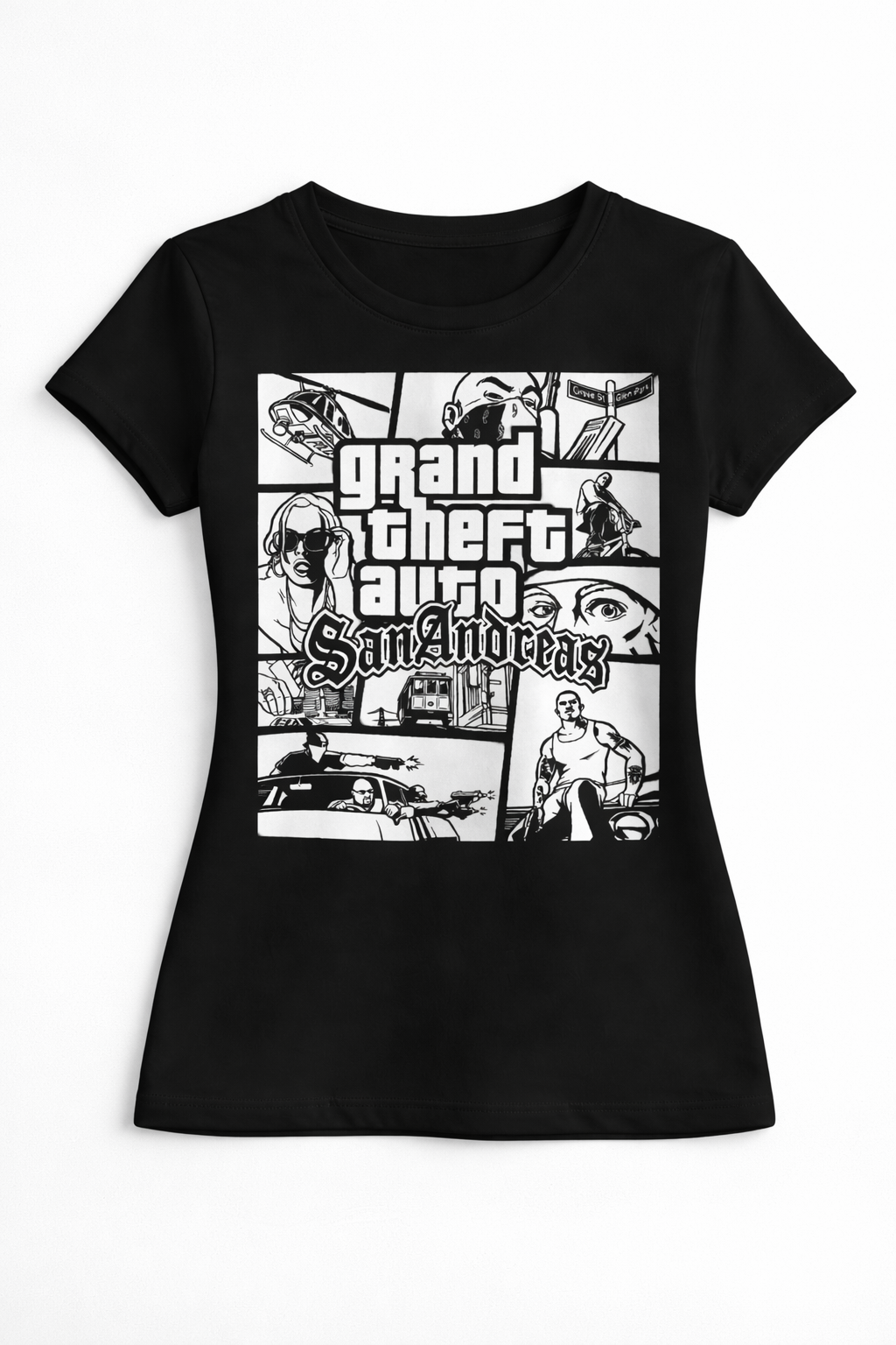 Estampa do clássico jogo Grand Theft Auto San Andreas, também conhecido como GTA San Andreas. Jogo desenvolvido pela produtora Rockstar Games.
